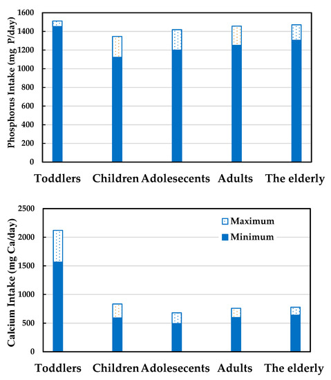 Intake scenario of phosphorus: as shown in Figure 2, the phosphorus intake of the population ranged from 1122.5 to 1511.8 mg P/day. The group with the highest phosphorus intake was the toddler group, with an intake from 1452.0 to 1511.8 mg P/day. The group with the lowest phosphorus intake was the group of children, with an intake from 1122.5 to 1345.6 mg P/day. The phosphorus intakes of all groups were higher than the AI but lower than the UL value, so there was no significant risk. The solid bars represent the minimum intake, and the hollow bars represent the maximum intake in Figure 2. The intake of phosphorus shows an increasing trend compared with the past. As reported in one study, the daily phosphorus intake of adults aged 19–64 years old between 1993 and 1996 was 1087 mg for males and 858 mg for females [2]. Wu et al. [2] and this study show that the main sources of dietary phosphorus for adults aged 19–64 years old were broken and flaked grains and fresh raw meats from livestock, poultry, and exotic animals, indicating that the dietary structure of the population has not changed fundamentally in recent years. The reason phosphorus intake has increased is possibly related to changes in the dietary proportion. As indicated in the dietary and nutritional status of Taiwan announced by the Ministry of Health and Welfare, the protein intake of the population at the current moment has grown significantly compared with the period between 1993 and 1996. This may be the reason for the increase in the phosphorus intake of the population. Moreover, the widespread use of phosphates cannot be ruled out as a cause of the increase in total phosphorus content in the diet.