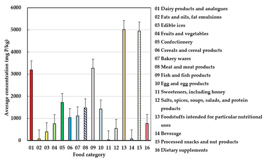 Comparison of the phosphorus concentrations for 16 food categories.