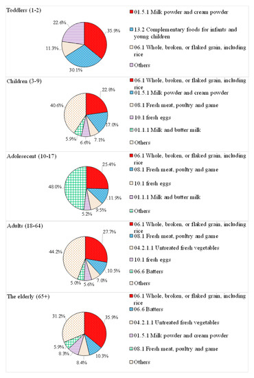 In this study, the food subcategories in which the individual EDI consumed by each exposure group was greater than or equal to 5% was listed as the main contributing food item. As shown in Figure 4, the main dietary sources of phosphorus in all age groups (e.g., whole, broken, or flaked grains, including rice; fresh meat and poultry; as well as milk powder and cream powder) were foods without added phosphates, mainly containing natural phosphorus. Thus, it can be estimated that natural phosphorus is the main source of phosphorus intake in the diet of the Taiwanese population.