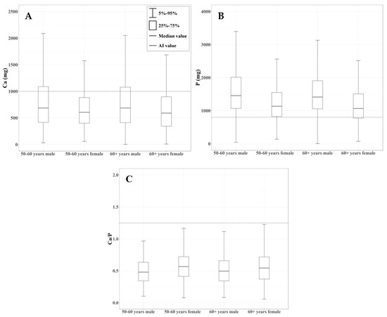 As shown in Figure 5, (A) 69.3% of adult males over the age of 60 years old had calcium intakes below 1000 mg, 68.4% of adult males from 50 to 60 years old had a calcium intake below 1000 mg, and adult females from the same age range had higher calcium intakes by 11.5% and 11.3%, respectively. (B) Phosphorus intakes are lower than 800 mg in 11.1% of adult males and 25.8% of adult females over the age of 60 years, in 8.4% of adult males, and in 22.6% adult females between 50 and 60 years of age. (C) The calcium:phosphorus ratios calculated and obtained from the AI of phosphorus and calcium showed that 99.1% of males over 60 years, 98.4% of females over 60 years, 99.3% of male adults 50–60 years, and 97.7% of females of 50–60 years had ratios lower than the reference calcium:phosphorus ratio of 5:4.