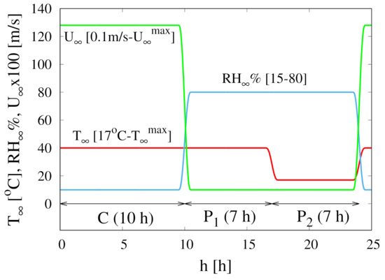 - A third pause stage (, 7 h), simulating the night period, characterized by a low temperature C, high Relative Humidity and very low air velocity m/s.