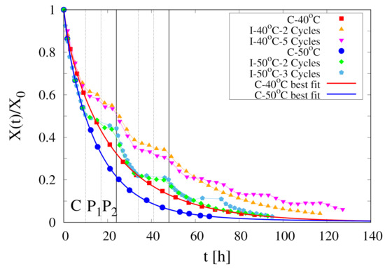 Collection of experimental data for continuous and intermittent drying of spherical pears at C, 50 C, m/s. Vertical lines highlight the different stages of the first two cycles for intermittent drying experiments. Continuous thick (red and blue) lines represent the best-fit curves, Equation (22), for the two continuous drying experiments C-40 C and C-50 C.