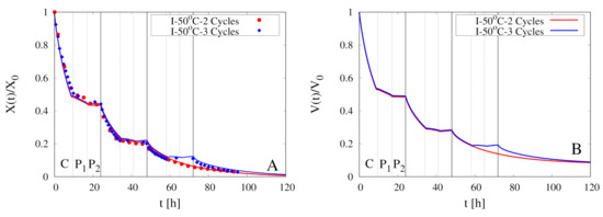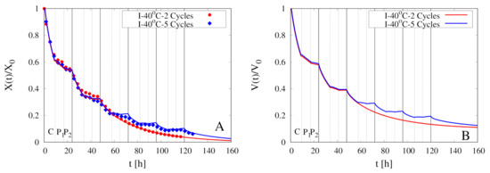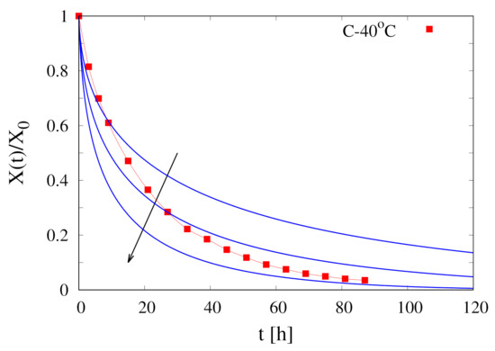 Figure 5 shows the excellent agreement between experimental data, at both temperatures C, 50 C, and model predictions (continuous red and blue curves, coefficient of determination > 0.99) with no adjustable parameters. Indeed, there is no need to introduce a concentration-dependent diffusion coefficient, Equation (3), that would require the estimate of the parameter. For this reason, we set also for all the subsequent simulations of intermittent dehydration.
