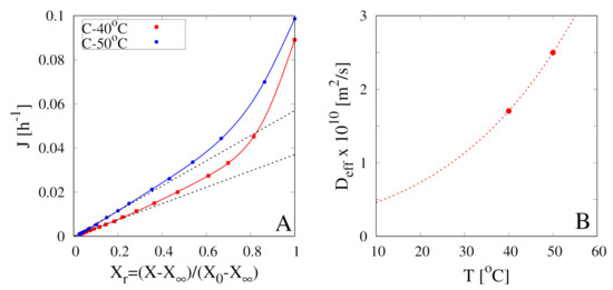 (A) Dehydration-rate curves J vs. for continuous dehydration tests at C, 50 C, m/s. Continuous lines represent the best-fit curves Equation (23). Black dashed lines highlight the asymptotic (large t, small ) linear behaviour, Equation (21). (B) Estimated effective water diffusivity at C, 50 C (filled points). The dashed line represents the Arrhenius behaviour, Equation (24).