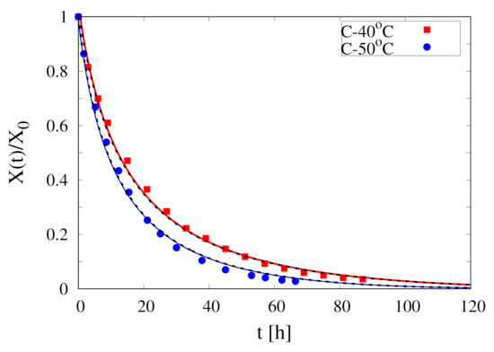 Comparison between experimental continuous dehydration curves vs. t at C, 50 C and m/s (filled points) and model predictions (continuous and dashed lines) with given by Equation (24). Continuous red and blue curves represent the non-isothermal model Equations (25)–(29). Black dashed lines represent the non-isothermal simplified model with , Equation (31).