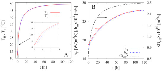 If the thermal diffusivity of the food material is significantly larger than water diffusivity , we can assume that the temperature is uniform inside the sample and equal to the boundary temperature, i.e., . Consequently, the partial differential equation Equation (9) for can be replaced with the ordinary differential equation describing the temporal evolution of the boundary temperature