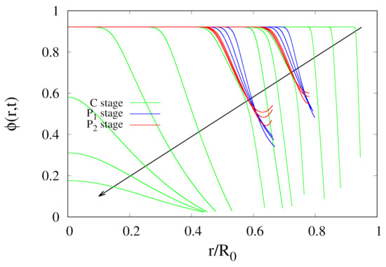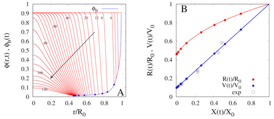 where is the initial uniform water volume fraction. This macroscopic observation finds its microscopic counterpart in the assumption of a constant and unitary shrinkage coefficient . It must be pointed out that the assumption does not imply that the shrinkage velocity is constant, nor in time or space, but rather that, according to Equation (2), the shrinkage velocity is directly proportional to the local concentration gradient. Therefore, the shrinkage velocity asymptotically tends to zero, at each point in the sample, when the water concentration gradient goes to zero everywhere in the system, i.e., equilibrium conditions are reached.