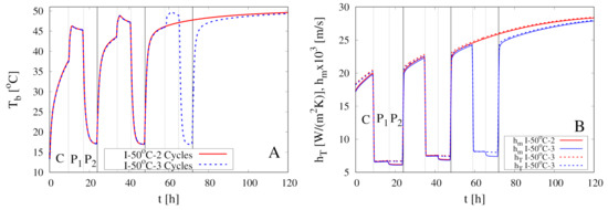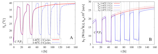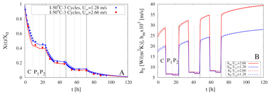 Figure 6A shows the temporal evolution of the temperature at the center and at the sample boundary for the continuous dehydration at C. Due to the high value of the product thermal diffusivity m/s , the two temperatures and almost coincide for h. This is the only numerical result that differs from experimental observations by Silva et al. [11]. These authors observed an appreciable difference between and in the convective stage, and this is quite difficult to explain if one considers the high value of the thermal diffusivity of the pears.