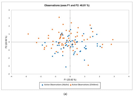 The MFA depicting the relationship between lingual tactile sensitivity, food neophobia, texture preference and food frequency of consumption is shown in Figure 8a,b. The observations plot (Figure 8a) showed that children (orange dots) and adults (blue dots) were both distributed across the plot, with no obvious separation of adults and children.