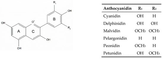 Anthocyanins are the compounds responsible for the purple, blue and red colors of various plant parts such as roots, flowers, fruits and leaves [1]. Chemically, anthocyanins are polyphenolic compounds that belong to the flavonoid family. They are structurally based on the polyhydroxy or polymethoxy derivatives of 2-phenylbenzopyrylium (flavylium ion). In plants, anthocyanins are found as glycosides of their respective aglycones, known as anthocyanidins. Anthocyanidins are composed of an aromatic ring A bound to a heterocyclic ring C that contains oxygen, also bound to an aromatic ring B through a carbon-carbon bond (Figure 1). Although more than 15 anthocyanidins have been identified, the most commonly found in nature are cyanidin, delphinidin, malvidin, peonidin, pelargonidin and petunidin. Cyanidin, delphinidin and pelargonidin, the nonmethylated anthocyanidins, constitute around 70% of colorful plant-based materials. A wide variety of anthocyanins (more than 700) have been reported in literature. They differ in the (i) number and position of the hydroxyl (OH) groups; (ii) methylation degree of the OH groups; (iii) nature, number and location of sugar moieties bound to the aglycone (arabinose, galactose, glucose, rhamnose, rutinose and xylose are frequently bound to anthocyanidins as mono-, di-, or trisaccharide forms; anthocyanins are mostly glycosylated in the 3-OH position and, to a lesser extent, in both the 3-OH and 5-OH positions); and (iv) presence of aliphatic or aromatic acids linked to the sugar moieties (sugar residues are commonly acylated with p-coumaric, caffeic, ferulic, sinapic, p-hydroxybenzoic, malonic, oxalic, malic, succinic or acetic acid) [2,3].