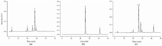 HPLC separation of anthocyanins (520 nm) from a black carrot extract (a) strawberry extract (b) and their mixture (1:1, v:v) (c). For peak assignment see Table 1.