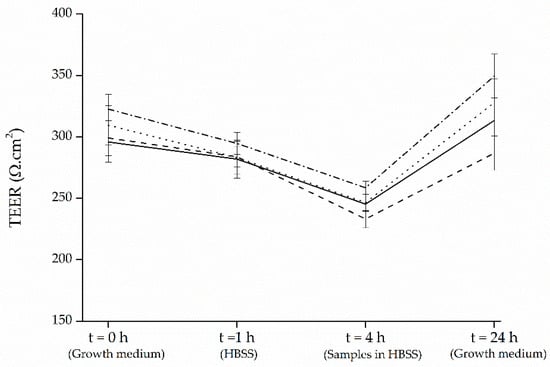 Prior to performing transport experiments, MTT assay, evaluating the cellular viability related to mitochondrial activity, was performed to ensure that the extracts are intoxic to Caco-2 cells. Additionally, Caco-2 cell monolayer integrity was tested using TEER measurement and only monolayers with a TEER value above 300 Ω.cm2 were utilized for the transport experiments. The TEER measurements applied to examine the integrity of monolayers showed that initial TEER values were mostly retained (≥91%) as a result of pre-incubation of Caco-2 cells with HBSS for 1 h (Figure 3). However, treatment of cells with the black carrot and strawberry samples for 4 h resulted in reductions of TEER values (17−22%), which were restored after 24 h (≥96% of initial values), suggesting that the decrease in integrity of cell layer was not irreversible. Moreover, even though the TEER values reduced after transport, yet they were above the acceptable minimum level indicated in the previous studies (200 Ω.cm2) [46].