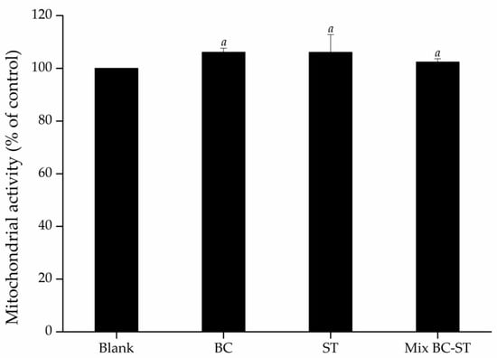 Mitochondrial activity (measured using MTT assay) of Caco-2 cells exposed to black carrot (BC), strawberry (ST) and their mixture (Mix BC-ST), expressed as % of control (no treatment). Different letters indicate significant differences.