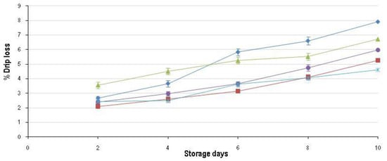 Moisture loss is a major concern in dealing with frozen meat; the results in Table 2 indicate that thaw loss (average of all the thaw treatments as thaw rate had no effect) increased significantly as freezing rate increased. However, thaw losses are not the only moisture loss concern. Drip loss (moisture loss during display) of packaged meat is also important, especially since it plays a prominent role in the aesthetic appeal to the consumer. The percentage drip loss (Figure 1) was mainly influenced by freezing rate and secondly by the thawing rate (only significant on days 2 and 4). On days 2 and 4, FR_4h lost significantly more fluid than all other treatments; from day 6 through 10, FR_1h lost significantly more moisture than all other treatments. These freezing rates lost more fluid than the rest for different hypothesized reasons. FR_4h lost more moisture due to the damage to the ultrastructure because of the ice crystal formation [4], which resulted in the inability of the myofibrils to contain the moisture [20,22]. For FR_1h, a large amount of intracellular ice crystals formed resulting in a low thaw loss (Table 1) but more severe protein damage [3]. The rapid increase in drip loss (Figure 1) could thus be attributed to the decrease in ability of the water to interact with the proteins. The decrease in interaction thus led to accelerated movement of ‘free’ and ‘entrapped’ water from the intracellular spaces to the extracellular space. The water then moved out of the meat through the enlarged ‘drip loss channels’ that formed during the shrinkage of the myosin lattice post mortem [23].