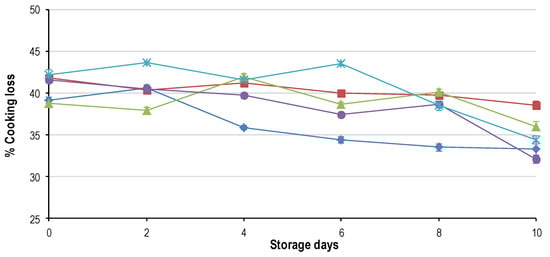 Only the freezing rate had a significant effect on the cooking loss on each of the storage days. Cooking loss and drip loss were negatively correlated (R2 = 0.402, p < 0.0001) indicating that as the drip loss increased (Figure 1) the cooking loss decreased (Figure 2). It seems that the same ice crystal damage that caused the slow frozen samples (FR_24h) to lose more moisture during thawing also caused higher cooking losses. Initially, FR_2h, FR_8h and FR_24h lost significantly more moisture than FR_4h and FR_1h. Over time, FR_2h did not change; FR_4h and FR_8h remained relatively constant but started decreasing from day 8 onwards. FR_24h was significantly higher for days 0 through 6 where after a rapid decrease commenced and FR_1h decreased rapidly over the entire shelf-life.