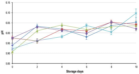 The pH increased (p < 0.05) gradually over time (Figure 3) in all the freezing treatments. Even though the freezing rate had a significant effect on days 0 through 8, the split-plot ANOVA showed a very weak significant interaction for freeze*day and freeze. However, a strong significance (p < 0.0001) for the main effect of day was evident. This suggests that the increase in pH was most likely more affected by time than by the freezing rates.
