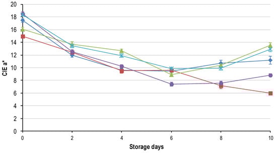 The colour of the meat was evaluated with two methods namely, CIE L*a*b* with calculated hue and chroma and the ratio of oxymyoglobin (OMb) to metmyoglobin (MMb) on the surface. Freezing rate had an effect on each sampling day for all the colour parameters, which is contradictory to literature reports [29,30,31] where no differences were found. The CIE L* (lightness) did not change dramatically during the shelf-life trial oscillating from 30–35 in all the treatments. The CIE b* (yellowness) decreased gradually over time for all the freeze treatments from approximately 10.31 ± 0.33 (day 0) to 9.15 ± 0.15 (day 10).