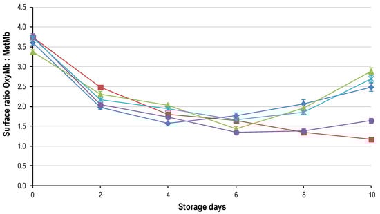 The decline in redness (CIE a* and OMb:MMb) over time (Figure 4 and Figure 5) was noticeable from day 0–6, where after a slight increase was evident in most of the treatments. The increase from day 8 to 10 can be attributed to microbial spoilage and the formation of a slime layer on the surface. The slime layer altered the reflectance spectra seeming to increase the redness of the meat [28]. The rapid drop-off in redness between day 0 and 2 can be attributed to the freeze/thaw treatment. During frozen storage the metmyoglobin reducing activity (MRA) governed by the NADH-cytochrome b5 reductase enzyme is lost causing more rapid accumulation of metmyoglobin on the surface of the meat [29]. In conjunction, freezing causes the release of the mitochondrial enzyme β-hydroxyacyl CoA-dehydrogenase (HADH). This enzyme utilizes NADH thereby depleting the co-factors used by the MRA and further accelerating the formation of metmyoglobin [29]. This is supported by the increase in hue angle over time (an indication of metmyoglobin accumulation), which was negatively correlated (p < 0.0001; R2 = 0.660) to OMb:MMb (Figure 5).