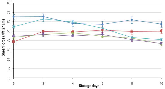 The toughness (Figure 7) of the meat was only influenced by freeze treatment. Over all the storage days, FR_1h consistently had the toughest meat (65–57 N). FR_24h followed suit on days 0 through 4 (peak at 63.02 ± 2.54), where the toughness rapidly decreased to reach a minimum on day 10 (41.02 ± 1.17). The other freeze treatments increased slightly from day 0 to day 2 and remained constant up to day 6 where after FR_4h, FR_8h decreased rapidly, and FR_2h continued to remain constant. Therefore, if a baseline value for shear force for fresh meat is set at 58–110 N as stated in [36], then literaturefreezing at rates between FR_2h and FR_8h could be seen to have a tenderizing effect. This is likely due to the structural damage caused by the ice crystals as postulated. For FR_1h the values reported in this study are above those for the baseline, which is contradictory to other researchers [36,37] who reported that a rapid rate of freezing resulted in more tender meat. It is argued that minimal structural damage occurred in FR_1h due to the dominance of intracellular ice crystals, and therefore the integrity of the muscle fibres were retained resulting in no tenderizing effect by freezing. As for FR_24h, the initial high shear force values could be attributed to the high loss in moisture, which caused compression of the muscle fibres resulting in more muscle tissue per area and higher peak forces. However, severe ultrastructure damage as caused by the ice crystals and changes in the proteins because of the freeze/thaw cycle likely resulted in the proteins being more accessible to the tenderizing enzymes resulting in tenderization over time.