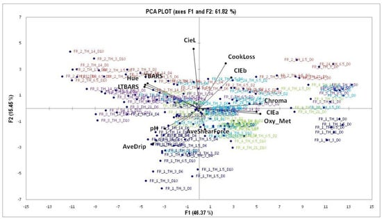 The first two principle components (F1 and F2) explained 61.82% of the overall variation in the meat quality data (Figure 8). From the discriminate analysis (DA, results not shown), thawing rate had no significant effect on meat quality (as defined by [20]) as no clear separation could be seen between the five treatments. The DA for freezing rate showed partial separation of the five rates, which has been highlighted in the PCA plot (Figure 7).