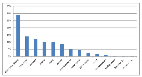 Food and beverage commercials covered 9.7 h out of 51.7 h of total commercials (18.8%). The length of food and beverage commercials ranged between 5 and 60 s, and most of the commercials had a length of 15 s (707 commercials). Children’s TV shows were the type of program during which food and beverage commercials were mostly broadcasted (29% of total commercials), compared to the rest of the shows scheduled (χ2 = 180.02; p < 0.001) (Figure 1). No significant differences were found between the total of food and beverage commercials aired during the weekdays (49%, n = 861/1756) compared to the total of food and beverage commercials aired on weekend days (51%, n = 895/1756).