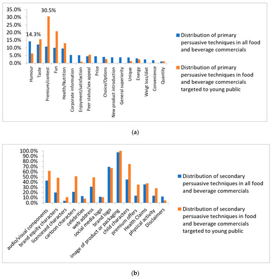 Among primary persuasive techniques, “humor” was the most frequently used in all food and beverage commercials (14.3%) (Figure 2a). This technique focuses on jokes and sketches. Considering food and beverage commercials targeted to a young public, the most used primary persuasive technique was “premium/contest” that was used in 30.5% (n = 186/610) of food commercials targeted to the young public (Figure 2a).