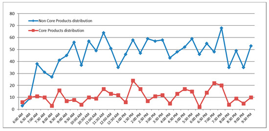 The time slot of 7:30 p.m. (during peak viewing time of children) registered the highest number of non-core products (Figure 3). During the day, the transmission of core products was constantly lower than non-core products, with no statistical difference between the number of core products advertised during non-peak viewing time and core products advertised during peak viewing time. Moreover, in each time slot, the number of non-core products advertised was significantly higher than core products. On average, it was found that the broadcasting for non-core products was 4.4 products per hour during non-peak viewing time, which increased to 5.5 products per hour during peak viewing time. As for core products, the average broadcasting was of one product per hour during non-peak viewing time, that increased to 1.5 products per hour during peak viewing time.
