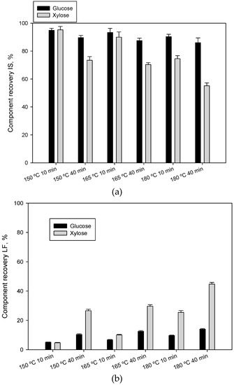Sugar recovery for each operating conditions of liquid hot water pretreatment. (a) On insoluble solid (IS); (b) on liquid fraction (LF). Data were calculated for total potential glucose and xylose.