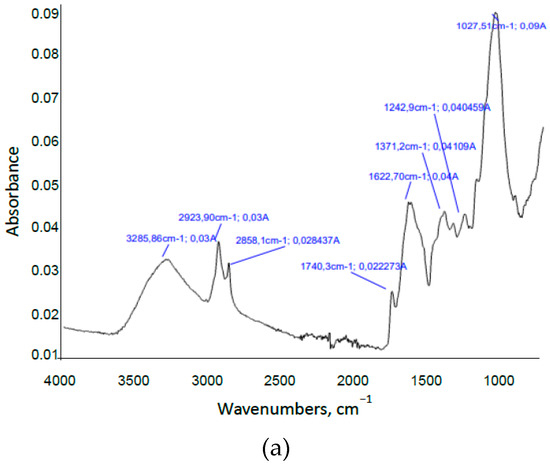 Finally, infrared analysis was performed in the range of 4000–400 cm−1 using a Fourier transformed infrared spectrophotometer (FTIR), Perkin-Elmer, Spectrum-65 model (Perkin-Elmer, Madrid, Spain).