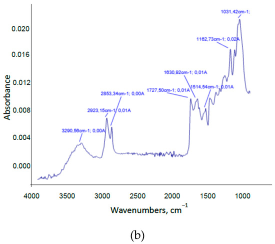 The Fourier transform infrared spectroscopy (FTIR) technique was used to elucidate structural changes on the material during liquid hot water pretreatment. Figure 3a,b shows the infrared spectra of raw material and insoluble solid resulting from pretreatment at 180 °C for 40 min, respectively. The complexity and heterogeneity of materials were shown by the abundant and overlapped absorption bands. Representative bands/peaks found in spectrum of raw material were as follows [75,76]: 3286 cm−1 (O-H stretching), 2924 cm−1 (C-H stretching), 2858 cm−1 (-OCH3 methoxyl and C-H stretching), 1740 cm−1 (C=O stretching), 1623 cm−1 (C=C benzene stretching ring and C=O stretching conjugate with aromatic rings), 1371 cm−1 (symmetric C-H bending from methoxyl group), 1243 cm−1 (weak O-C stretching), and 1028 cm−1 (C-O ether vibrations and C-C ring vibrational stretching). After liquid hot water pretreatment, a decrease in absorbance was produced. An absorption peak at 1728 cm−1 attributed to C=O vibration of acetyl or COOH groups was also significantly enhanced (in relation to the rest of peaks/bands). A major number of small peaks between 1728 and 1031 cm−1 were found (characteristic of pure lignin spectra). Of special relevance were the new peaks found at wavenumber of 1514 cm−1, characteristic of aromatic skeletal vibrations of lignin, and 1163 cm−1, attributed to C-O-C asymmetric valence vibration. Finally, the characteristic peak at 1371 cm−1 of symmetric C-H bending from methoxyl group decreased as a consequence of the degradation of cellulose and hemicellulose. According to these results, a major proportion of lignin in the pretreated material seemed to be observed since lignin offered a characteristic peak at about 1514 cm−1, corresponding to the aromatic skeletal vibration, and a higher number of small peaks between 1750 and 1000 cm−1 approximately [73]. This observation could indicate that no depolymerization of lignin during the pretreatment occurred, as already suggested by Ázar et al. [77].