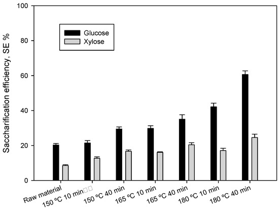 The accessibility of cellulose from the pretreated material to enzymatic attack is one of the most important variables to measure the effectiveness of liquid hot water pretreatment [78]. The results of the enzymatic hydrolysis were expressed in terms of “saccharification efficiency” in Figure 4. Saccharification efficiency was calculated according to the procedure described in Section 2.6. Data were calculated for total potential glucose and xylose, not only from cellulose and hemicellulose. In the conditions tested and focused on glucose, the percentages of SE were between 21.44% (150 °C and 10 min) and 60.62% (180 °C and 40 min). The comparison of these results with that obtained on the raw material without pretreatment (20.3%) indicates that the pretreatment considerably improves the accessibility of enzymes to the pretreated material for breaking the complex polysaccharides, especially if pretreatment is performed at the highest temperature and residence time. Similar results have been reported by other researchers in their published studies [39,50]. Regarding the effect of residence time in the SE, at 150 °C, values changed from 21.44% (10 min) to 29.44% (40 min). At temperatures of 165 °C and 180 °C, a similar effect was observed, with values that increased from 29.79% and 42.14% (10 min) to 35.03% and 60.62% (40 min), respectively.