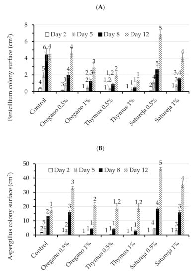 After five days of storage, the maximum (95.03%) and minimum (12.92%) inhibition of Aspergillus was recorded for thyme 1% and Satureja 0.5%, respectively. After eight days of storage, two Satureja samples (at 0.5% and 1%) and oregano at 0.5% showed that the surface occupied by the Aspergillus colony was greater than that of the respective control (no added dry aromatic plants after eight days of storage). It seems that Penicillium growth was inhibited from a minimum of 39.82% (Satureja 0.5%) to a maximum of 89.15% (thyme 1%) in all PDA samples. After 12 days of storage, only PDA with thyme showed Aspergillus colony surfaces similar to that of the respective control, with the rest of the samples showing significantly higher values (Figure 1B). It seems that beyond this period, the addition of the aromatic plants promotes the growth of Aspergillus. Both PDA samples with thyme and the sample with oregano 1% inhibited the growth of Penicillium after 12 days of storage, whereas Satureja at 1% and oregano at 0.5% exhibited similar values to that of the control (Figure 1A). Only Satureja at 0.5% showed a colony surface area higher than the control.