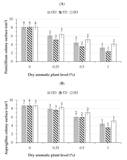 Average growth (cm2) in bread for (A) Penicillium and (B) Aspergillus following treatment with dried aromatic plants after 7 days of storage. OD—oregano, TD—thyme, and SD—Satureja dry matter. Similar number superscripts (reported above each column) for the same plant are not significantly different (p < 0.05) by Duncan’s multiple range test.