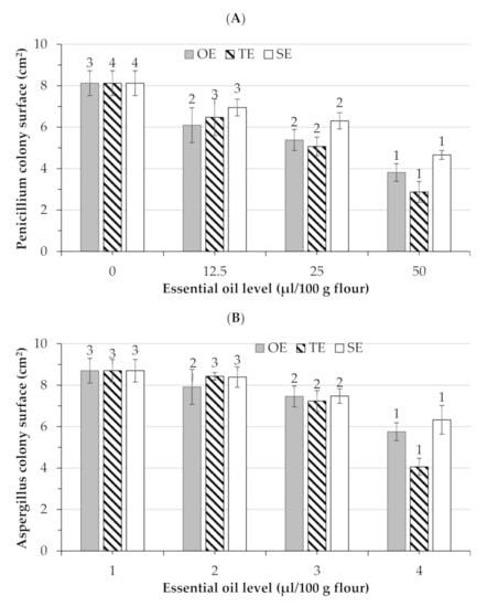 Average growth (cm2) in bread for (A) Penicillium and (B) Aspergillus following treatment with essential oils after 7 days of storage. OE—oregano, TE—thyme, and SE—Satureja essential oil. Similar number superscripts (reported above each column) in the same plant are not significantly different (p < 0.05) by Duncan’s multiple range test.