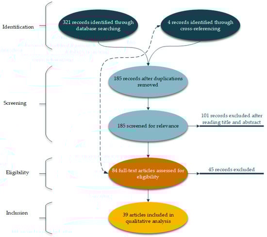 To ensure that the greatest number of articles are found in the common field of food security and social capital, the present study used the Prisma method. The Prisma method is a systematic literature review method constituting four steps: (1) Identification, (2) screening, (3) eligibility, (4) inclusion [23,24]. These four steps are designed in such a way that researchers can find the most relevant articles to the subject under study. A multidisciplinary perspective was adopted to ensure that the maximum number of related articles was reached, and searches of databases were not limited to any journals or any specific category of journals. This method’s output is a database of relevant articles that are ready for quantitative and qualitative analysis. For the current study, at the identification step, 321 articles were found through initial searches in Thomson Reuters Web-of-Science (WoS) (148 out of 321 articles) and Elsevier Scopus databases (173 out of 321 articles). It is worth noting that the search among the mentioned databases took place until the end of September 2020. To this end, the keywords of social capital and food were searched simultaneously in the title, abstract, and keywords of these databases’ articles. Four more articles were added in this step to the identified articles based on the cross-referencing process. During the screening step, the articles passed through two filters of checking duplicates and relevance. At this step, first, the duplicate articles which were found in both databases were deleted 185 individual articles went to the next screening step. In this step, the articles are evaluated based on the relevance of their titles and abstracts where, as a result, 101 articles are eliminated, and 84 articles went to the eligibility step. At the eligibility step, the full text of 84 articles was carefully read, and finally, 39 articles were included in the data of the present study (the inclusion step). All the results presented in this study are based on the analysis of these 39 articles. Figure 1 shows a visual view of the process of implementing the Prisma systematic literature review method in this study.