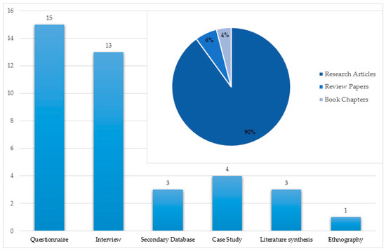 The articles reviewed in this study used different tools to collect data for reaching their research objectives. Figure 3 illustrates the data collection methods employed in the 39 research papers. The questionnaire was the most common data collection tool among the reviewed articles as it is employed with 15 publications. In addition, 13 papers used the interview as the data source of their research. Secondary database and Literature synthesis methods are performed within three publications. Case study and Ethnography with, respectively, four and one publications are other data collection methods applied among the articles. Figure 3 also shows that 90% of the total documents reviewed are original research papers, while review articles and book chapters with 6% and 4%, respectively, are other types of documents that were reviewed.