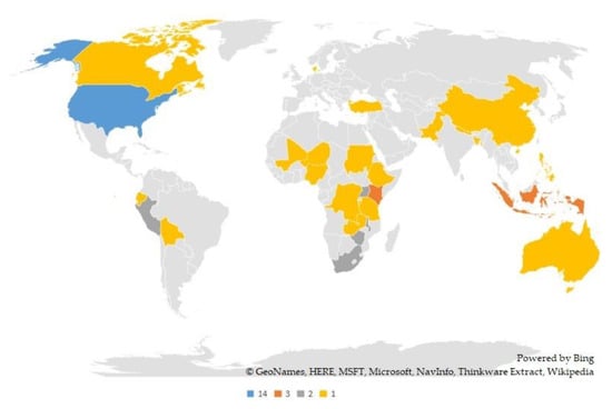 Numerous countries have explored social capital and food security concepts. Within the 39 reviewed papers, 33 countries are identified. There are countries where food security and social capital have been studied more than once, which shows the importance of these two concepts in the respective countries. As highlighted in Figure 4, these articles are more concentrated in some countries than others. The blue color designs the USA, which has the highest number of publications, 14 papers. Indonesia and Kenya, presented in orange color, with three research papers, are other countries with the highest number of publications on these topics. Moreover, countries, such as Zimbabwe, Peru, Uganda, South Africa, and Malawi, have had two published papers in the common area of these two concepts, and they are presented in Figure 4 with the dark grey color. The countries with a single publication are scattered all over the world and presented in yellow color in Figure 4.
