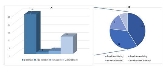 Figure 5A discloses that the vast majority of the articles focus on the farmers, where the food products are produced. Moreover, 11 out of 39 articles have concentrated on food security problems in the consumption section. Figure 5B also shows that food availability and food accessibility with 30 out of 39 articles are the food security pillars that have the most attention in the common literature of food security and social capital.