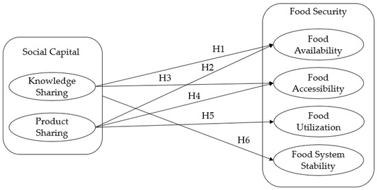 Conceptual model of the study; the effect of social capital on food security. H1: Social capital improves food availability through sharing knowledge among members of a community;.H2: Social capital improves food availability through sharing products among members of a community; H3: Social capital improves food accessibility through sharing products among members of a community; H4: Social capital improves food accessibility by sharing knowledge among members of a community; H5: Social capital improves food utilization through sharing products among members of a community; H6: Social capital activities strengthen food system stability.