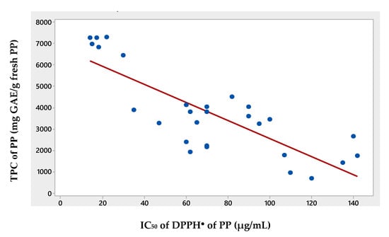 In the present study, significant negative correlations of −0.813 and −0.743 were observed between the estimated TPC and the IC50 values (as expected), using Pearson correlation, as well as using Spearman Rho tests (data not shown). The scatter plot of the correlation of these two values is shown in Figure 1. Previous studies have also demonstrated this negative correlation between the TPC and the antioxidant capacity of PP extracts, based on DPPH radical scavenging [40,41], or on other methods of estimation of antioxidant activity [42,43].