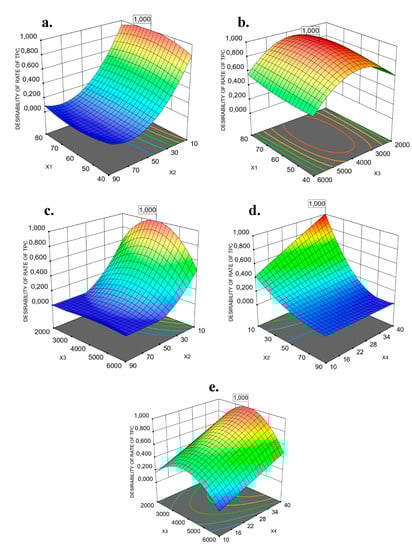 The interactions of the X1 and X3 extraction parameters and the interactions between the other two parameters were found to be significant for REEqVR IC50 DPPH●, based on operational costs, as presented in Table 5 and Figure 3. Additionally, significant interactions seem to exist between the parameters of X2X4, X22X4, X2X32 and X12X32, based on the ANOVA analysis of RTPC.