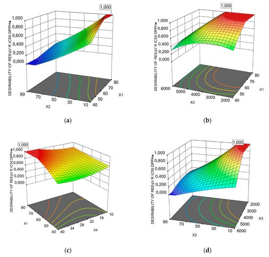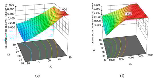 The interaction with X2X4 was statistically significant for the two responses, based on operational cost. Furthermore, concerning the response of REEqV R IC50 DPPH●, the interactions of X1X2, X1X3, X1X4, X2X4 and X3X4 were estimated as significant, according to ANOVA, as presented in Table 6. In order to gain a better understanding of the results of regression equations, graphical representations of three-dimensional response surfaces and two-dimensional contour plots are depicted in Figure 2 and Figure 3. The 2–3D plots were created by plotting the response against two independent variables, using the z-axis, while retaining the other two variables at their zero levels. These graphs are very useful to visualize the relationship between independent and dependent variables and the interactions between two variables. Different shapes of the contour plots indicate different types of interactions between the variables. A circular contour plot means that the interactions between the corresponding variables are negligible. An elliptical contour suggests that the interactions between the corresponding variables are significant [52].