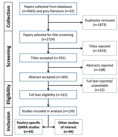 The search was done on each database considering their respective starting year—1956 for Web of Science, 1788 for Scopus—to the date of the 11 February 2020. A total of 4565 articles (2242 from Web of Science and 2323 from Scopus) were collected, and 32 papers from the grey literature (mostly reports from European health agencies and the WHO) were added. Then, articles were screened that involved the removal of duplicates and scrutiny of titles and abstracts. Records were considered eligible after thorough inspection of full texts. During the whole selection process, only articles that met potential inclusion criteria were included: studies related to poultry QMRA, predictive modeling, risk factors, and prevalence of poultry pathogens. The studies were included without geographical discrimination. Studies that did not comply with the inclusion criteria were rejected.