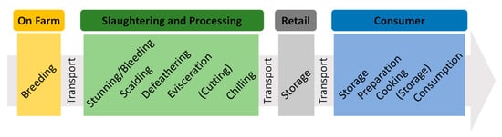 Poultry are transported from farms to slaughterhouses. Stages in poultry slaughtering consist of stunning, bleeding, defeathering, evisceration, and processing, which includes the chilling of whole carcasses or further processing like poultry portioning/cutting [,,]. Before transportation to slaughterhouses, chickens are not fed for less than 12 h to minimize the risk of contamination due to fecal leakage during transport []. This way, by emptying the bowels, it helps to reduce the skin contamination level by less than 5% after evisceration [].
