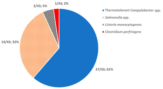 As illustrated in Figure 3, most of the collected papers dealt with thermotolerant Campylobacter spp. (61% 27/43), followed by Salmonella spp. (32%, 14/43). Other studies concerned Listeria monocytogenes and Clostridium perfringens (2/43 and 1/43, respectively).