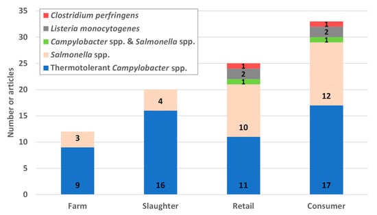 The overview of collected studies (Figure 4) revealed that most of them focused on Salmonella spp. and thermotolerant Campylobacter species, especially during the consumption stage.