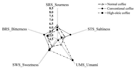 Electronic tongue analysis was performed to investigate the chemical sensors-assisted taste differences among the coffee and the results are shown in Figure 1. Electronic tongue analysis is a non-destructive pattern analysis method that does not require specific pretreatments and determines the sensitivity of food tastes through sensor arrays and a pattern recognition system [42]. Peanut coffee showed relatively lower sourness than normal coffee, and this is possibly associated with the increased pH in peanut coffee, as shown in Table 3. High-oleic peanut coffee exhibited lower bitterness compared to normal coffee, which may be attributed to a decrease in the phenylalanine (Table 1) and caffeine contents (Table 2) that are associated with bitterness [21]. Previous studies also demonstrated similar results, showing that changes in phenylalanine and caffeine content upon roasting were linked to the bitterness of Platycodon grandiflorum roots and peanut sprout extracts [19,30]. Peanut coffee showed higher saltiness, umami taste, and sweetness than normal coffee. Particularly, high-oleic peanut coffee marked the highest score in umami taste, probably because a relatively higher amount of glutamic acid in high-oleic peanut coffee (Table 3) reacts with sodium, leading to an increased umami taste [21]. Kato et al. [21] suggested that glutamic acid is representative of umami taste. Indeed, recent studies provide evidence that glutamic acid influences the umami taste sensor of electronic tongue analysis in ranges of oriental herb samples [19,20,22]. Peanut coffee exhibited higher sweetness than normal coffee, which coincides with the result of increased glucose, sucrose, and glycine contents in peanut coffee (Table 2). This result is consistent with a recent study showing that roasted peanut sprout extracts showed higher brix than the non-roasted extracts [30]. In regard to amino acids associated with sweetness, Lee et al. [19] reported that sweetness increased with an increased level of glycine in electronic tongue analysis of roasted Platycodon sample. The taste result by electronic tongue not only comes from major taste components of peanut but is an expression of a complex interaction of tastes from coffee and peanuts [43]. Electronic tongue analysis can exclude the subjectivity of panelists and offers analysis results within a short time and has therefore been widely utilized in recent years [43]. However, electronic tongues lack the capacity to reflect all the complexity of biological aspects associated with the human oral environment. Therefore, future studies are warranted in investigating links between the sensory aspects of foods obtained through electronic tongue and human tongue from panelists.