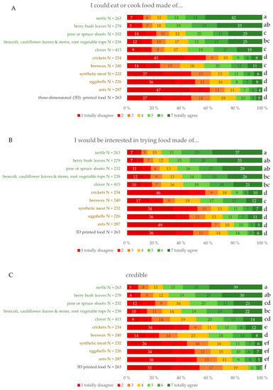 Willingness to try (Figure 2B) shows similar differences for the non-plant-based raw materials, as assessed via the statement “I could eat or cook food…” (Figure 2A). Consumers are not willing to try crickets, ants, eggshells, synthetic meat or 3D-printed food. Slight differences in the opinions on the plant-based raw materials were discovered compared to the statement regarding whether they could eat or cook those materials. Nettle and berry bush leaves were considered as the most credible (Figure 2C). For nettle, 73% of the respondents and 69% for berry bush leaves stated at least somewhat agreed to their credibility. These raw materials are already marginally used for food, which might explain the higher credibility. Insects are not seen as credible for usage as food. The allowance of crickets to be sold as food might explain the slightly, though not significantly, higher credibility compared to ants. However, the majority of the respondents consider insects as not credible food; 54% of respondents at least somewhat disagreed that crickets are credible and 66% that ants are credible. Distribution of replies regarding beeswax and credibility is similar to “could eat” and willingness to try. Finnish consumers do not consider 3D printing as a credible technology for food preparation; 3D-printed food was regarded as least credible together with synthetic meat, eggshells and ants. Only 11% of the respondents agreed to some extent that 3D-printed food is credible.