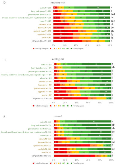 Nettle and berry bush leaves were also regarded as the most ecological raw materials (Figure 2E). The raw material representing side streams, broccoli and cauliflower stems and leaves and root vegetable tops were regarded as equally ecological compared to wild vegetables apart from nettle. Plant-based raw materials were highly regarded as ecological and more ecological than others; 79–89% of respondents at least somewhat agreed that the plant-based raw materials are ecological. Insects together with beeswax and eggshells formed the next ecological group; 53–63% of respondents at least somewhat agreed they are ecological. Synthetic meat was less regarded as ecological than the two previous groups but more than 3D-printed food. The raw materials which can be picked from the nature were also considered as natural and plant-based raw materials above others (Figure 2F). Only 5–7% of the consumers disagreed to some extent that the plant-based raw materials are natural. Insects were also regarded as natural but significantly less so than the plant-based raw materials. Over half (55–56%) of the respondents regarded insects as natural. As assumed in the wording, synthetic meat was not regarded as natural by consumers. In total, 75% of the respondents disagreed with the statement. Additionally, 3D-printed food was not regarded as natural, as only 82% of the respondents disagreed to some extent with the statement.
