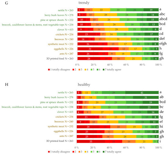 Based on the public discussion, it was assumed that insects could be considered trendy. Crickets were one of the first insects approved [11]. Half (51%) of the respondents at least somewhat agreed that crickets are trendy (Figure 2G). However, 23% of the respondents totally disagreed with the idea that crickets are trendy. Wild vegetables, except clover, were considered the most trendy. Eggshells, which are part of Finns’ everyday cooking, were considered the least trendy but this was not significantly different from synthetic meat or 3D-printed food.